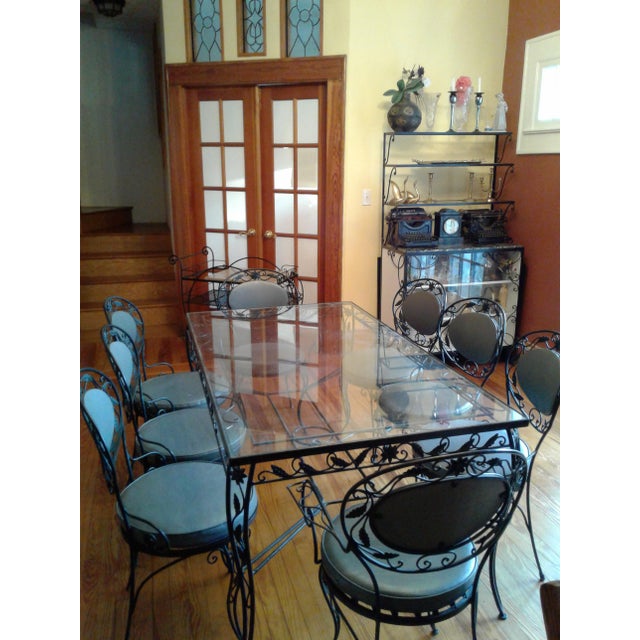 Wrought iron and glass top dining room table and six chairs.